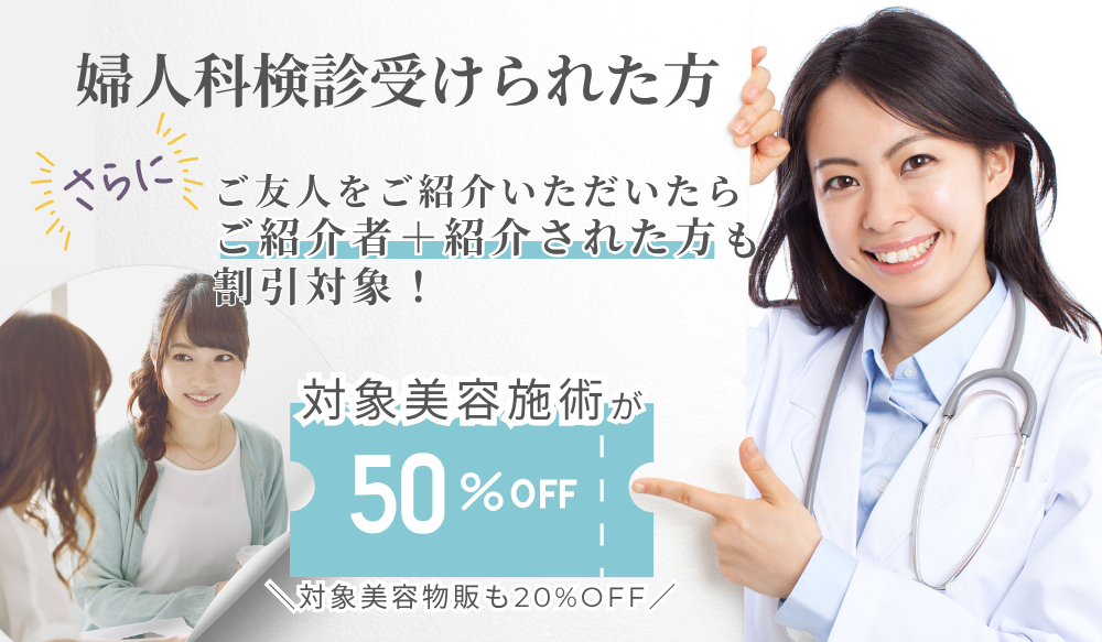 婦人科検診割・知人紹介割、モニター料金に該当する場合は、通常料金の50%OFFになります。